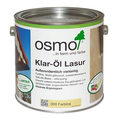 ОПИСАНИЕ ПРОДУКТА: Прозрачная лазурь Klar-Öl Lasur – многофункциональное покрытие для древесины для наружных работ. Идеальная грунтовка для мягкой и хрупкой древесины, древесины грубого распила, посеревших или обветренных деревянных поверхностей, позволяющая избежать неравномерного пропитывания. Также подходит для использования в качестве финишного покрытия после предварительной тонировки однослойной лазурью Einmal-Lasur или непрозрачной краской для наружных работ Landhausfarbe, для получения слегка блестящих и не требующих особого ухода поверхностей. ОБЛАСТЬ ПРИМЕНЕНИЯ: Для древесины, не находящейся под воздействием прямых солнечных лучей. (Внимание: Бесцветные покрытия не обеспечивают защиту от ультрафиолетовых лучей, а слабопигментированные покрытия обеспечивают слабую защиту от УФ-лучей. Таким образом, естественное потемнение и выцветание дерева под воздействием прямых солнечных лучей не предотвращается). Для получения слегка блестящих, не требующих особого ухода поверхностей (двери, окна, ставни, облицовка балкона, деревянный ростверк, потолок, садовая мебель), использовать лазурь Osmo Klar-Öl Lasur в качестве финишного покрытия после однослойной лазури Osmo Einmal-Lasur или непрозрачной краски Landhausfarbe. Одновременно является защитой от воздействия погодных условий и повышает износостойкость покрытия. Не требует грунтовки и финишного покрытия (1-2 слоя). Для надводной древесины в судостроении (палуба, мачта, поручни и т.д. из ценных пород древесины). Можно использовать для покрытия дощатых полов с повышенными нагрузками, тентовых палуб, садовой мебели из ценных пород древесины и т.п. (2-3 слоя). Продукт можно использовать в качестве грунтовки для покрытия старой, ломкой, мягкой, выветренной, посеревшей или шершаво-грубой древесины, во избежание неравномерного пропитывания. ПРИМЕЧАНИЕ: