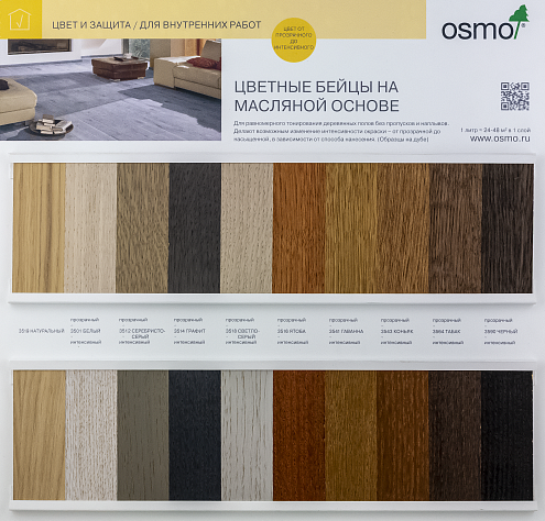 Область применения Все типы деревянных полов, например: массивная доска, паркетная доска, паркет, OSB и пробка, а также лестницы и мебельные поверхности. Подготовительные работы Поверхность древесины должна быть чистой, сухой (макс. влажность не более 20%) и не мерзлой. Продукт готов к применению. Разбавлять запрещено! Тщательно размешайте перед началом использования! Старые открыто-пористые краски очистите от грязи и пыли. Удалите старые лакокрасочные покрытия. Небольшие трещины, швы или отверстия выровняйте шпатлевкой ОСМО для древесины Holzpaste. Поверхность древесины необходимо тщательно отшлифовать. Сначала шлифовать грубой наждачной бумагой. Финишное шлифование рекомендуется проводить зернистостью P120 – для пола, P150 – для мебели. Перед нанесением масла необходимо тщательно удалить пыль веником, затем пылесосом. Применение Цветные бейцы на масляной основе OSMO Öl-Beize готовы к применению. Перед применением тщательно перемешать. Результат покраски зависит среди прочего от свойств и обработки древесины (породы, степени шлифовки и т.д.), поэтому рекомендуется сделать пробное окрашивание образца. Прозрачное покрытие: нанести очень тонкий слой на чистую сухую древесину при помощи щетки для пола OSMO Fußbodenstreichbürste, валика OSMI из микрофибры или шпателя вдоль волокон древесины и равномерно растереть белым падом. Оставить высыхать при хорошей вентиляции. Интенсивное окрашивание: нанести тонкий слой при помощи щетки OSMO для пола или валика OSMO из микрофибры и тщательно распределить вдоль волокон древесины. Для очистки рабочего инструмента рекомендуется использовать средство для очистки кистей OSMO Pinselreiniger — не содержит ароматических углеводородов, почти без запаха. Время высыхания Примерно 12 часов при t +23°С и относительной влажности воздуха 50%. При хорошей вентиляции. Низкие температуры и высокая влажность увеличивают время высыхания. Расход Заявленный расход: 1 л ≈ 24-48 м2 в один слой. Реальный расход зависит от свойств, структуры и подготовки поверхности, способа покраски, квалификации маляра и других факторов. Примечание Для покраски внутренних мебельных поверхностей используйте ткань или ветошь. Достаточно одного тонкого слоя. Для покрытия твердых темных пород древесины, содержащих большое количество маслянистых веществ (например, венге, мерант, мербау и др.), рекомендовано масло ОСМО с воском для твердых пород Klarwachs. Цвет 3501 Белый: Мы не советуем тонировать полы в интенсивно белый цвет (прозрачный или укрывистый) – из-за быстрого загрязнения поверхности и естественного пожелтения. Цвет 3519 Натуральный: При работе с этим цветом мы рекомендуем наносить только один тонкий слой при помощи кисти для пола или валика из микрофибры и после высыхания еще один финишный слой бесцветного масла с твердым воском Hartwachs-Öl Original. Таким образом получается естественный цвет свежей древесины – без эффекта поджига. На темных / красных породах древесины этот цвет будет давать слегка выбеленный эффект. Техническое описание. Высококачественная цветная грунтовка для деревянных полов и мебели. По сравнению с традиционными покрытиями, основу продукта составляют растительные ингредиенты, которые позволяют достичь равномерного окрашивания без пропусков и наплывов. Интенсивность окраски – от прозрачной до насыщенной. Простое применение – без промежут