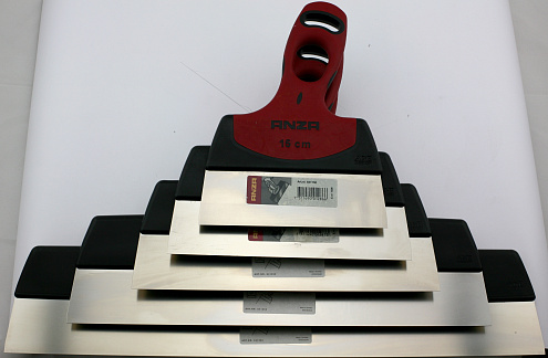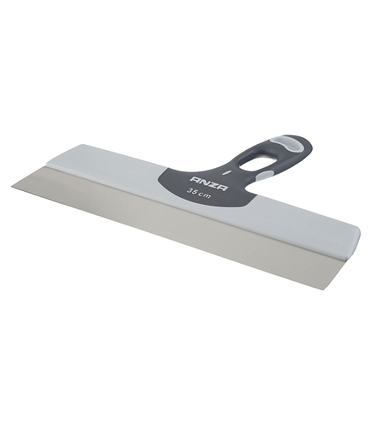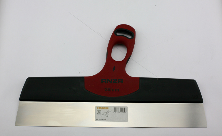 ANZA 2к 35 см 641350 фасадный шпатель с удобной эргономичной ручкой для шпаклевания, удаления обоев и для многих строительных, декоративных видов работ. Рабочее полотно из нержавеющей стали. Двухкомпонентная рукоятка обеспечивает максимальный комфорт даже с шириной полотна 350 мм. Этот инструмент разработан на основе пожеланий профессиональных отделочников, для которых качество работ находится в приоритете. Несколько зон захвата на рукоятке позволяют более точно наносить отделочные материалы, не оставляя при этом лишних следов. (Двухкомпонентная рукоятка может быть серого или красного цвета).
