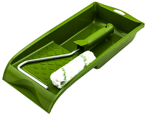 Комплект — ванночка, рукоятка и мини-валик из микроволокна с зеленой нитью, подходит для всех видов работ с масло-восками, антисептиками и составами для обработки и защиты древесины.