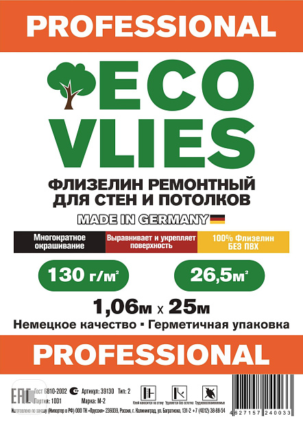 ECOVLIES малярный флизелин (Экофлиз) 130 грамм/м2 артикул 39130 – это самый универсальный материал для внутренней отделке стен, подойдет практически ко всем поверхностям. Идеально подходит для конструкций из гипсокартона, бетона и газобетона, не требует идеальной подготовки поверхности, экономит ваши деньги на шпаклёвке, скрывает трещины на стенах и выдерживает многократную перекраску. Перед последующей отделкой – поверхность обязательно загрунтовать. До начала работы, проверить номер артикула и партии. При рекламации прислать этикетку и отрезок бракованного рулона. Основание должно быть: сухим, прочным, чистым, ровным и гладким. Для этого необходимо: удалить старые обои и плохо держащуюся краску, зашпаклевать неровные поверхности и загрунтовать всю оклеиваемую поверхность. Использовать клей для флизелиновых обоев, по инструкции производителя и нанести на поверхность. Производитель рекомендует PUFAS для флизелиновых обоев. При оклеивании: рулон раскатывается только в одном направлении, наклеивание происходит без выдержки времени на пропитывание, прижимая их к поверхности мягкой обойной щеткой, шпателем или валиком из пористой резины для удаления воздушных пузырей. Каждое следующее полотно обоев наклеить встык. Рекомендуемая температура в помещении должна быть в пределах 18-25 градусов Цельсия. Для покраски использовать краску на водной основе. Окрашивание и наклеивание цветных обоев производить не ранее чем через 24 часа. При правильном наклеивании, обои удаляются со стены в сухом виде без остатка. Произведено и нарезано в Германии упаковано в России.
