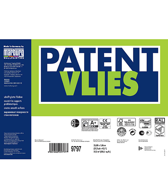 Marburg Patent Vlies 9797 гладкий, малярный флизелин – идеальный материал для подготовки поверхностей под покраску. Идеально закроет трещины на гипсокартоне, паутинку на стене, стыки плит перекрытия на потолке, будет идеальным основанием перед нанесением краски или поклейки тонких обоев. Вы сможете удалить его без следа и обновить дизайн помещения. Размер рулона 1,06 метра при длине намотки 25 метров, в рулоне мы получаем полноценных 26.5 м2 материала. Внимание! Условия бесплатной доставки данного товара по России могут отличаться от стандартных. Не путать с маркировкой 9797R – произведенного в Германии, но нарезанного и упакованного в России