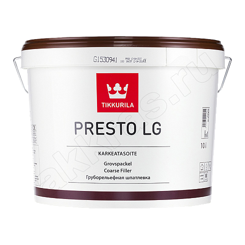 Водоразбавляемая, готовая к применению легкая шпатлевка ПРЕСТО ЛГ, применяется для шпатлевания в сухих помещениях. Наполняемость составляет 30 мм без растрескивания. Усадка незначительная, великолепная адгезия, даже без предварительного грунтования с кирпичом и бетоном. ОБЛАСТЬ ПРИМЕНЕНИЯ Предназначена для выравнивания и заделки неровностей на шероховатой поверхности. Применима, в особенности, для шпатлевания шероховатых бетонных и оштукатуренных поверхностей. Если поверхность будут окрашивать, рекомендуется повторное выравнивание более тонкой шпатлевкой, например, "Престо ЛХ" .